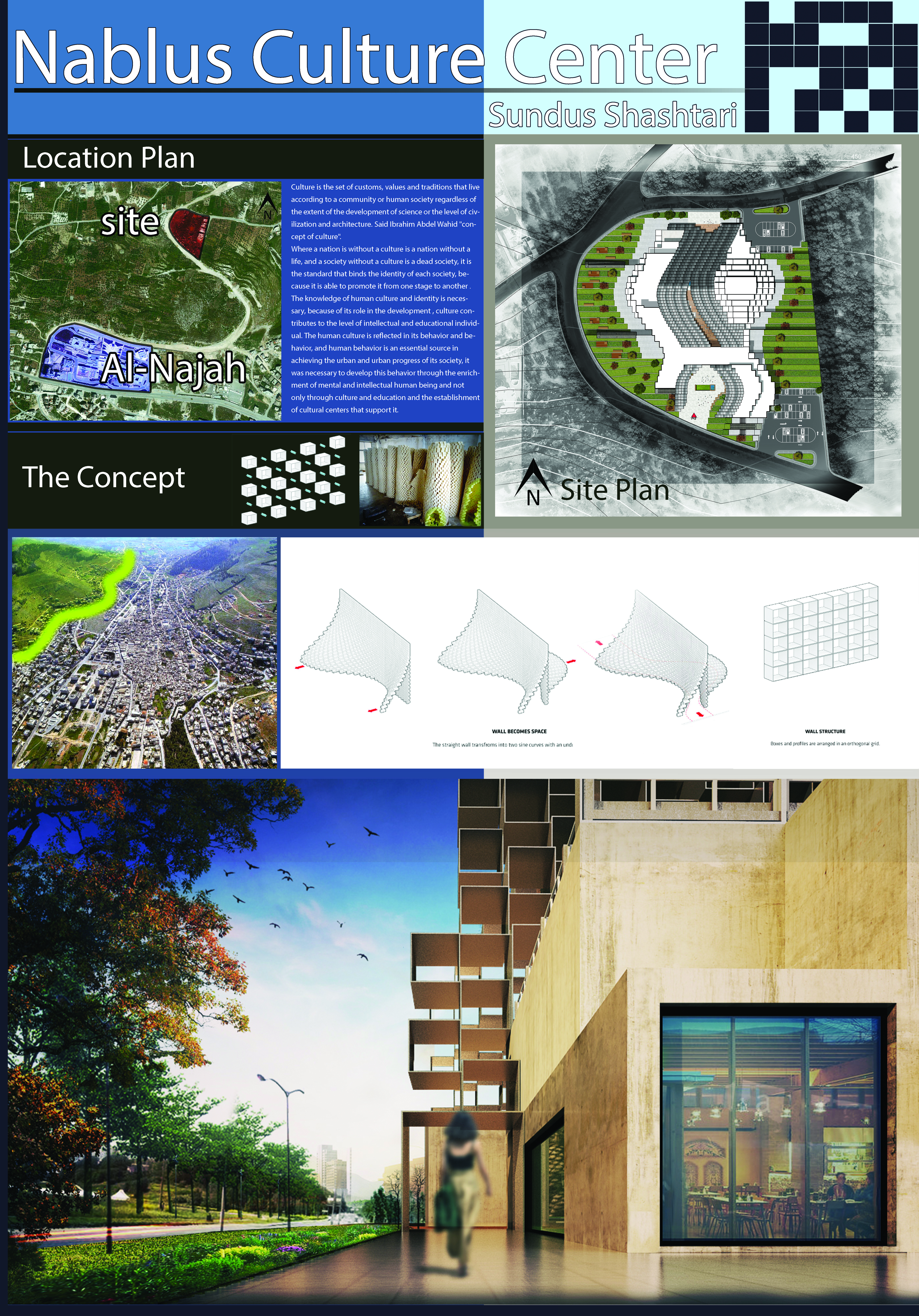 Design Concept: When designing a cultural center for the city of Nablus, the culture of the country should be taken into consideration. The soap of Nablus is considered as a building unit for the project. The functions were divided into two sections, creating spaces designed for the people. The project includes the following spaces: library, exhibition, theater, administration, cafeteria, educational spaces, recreational spaces.