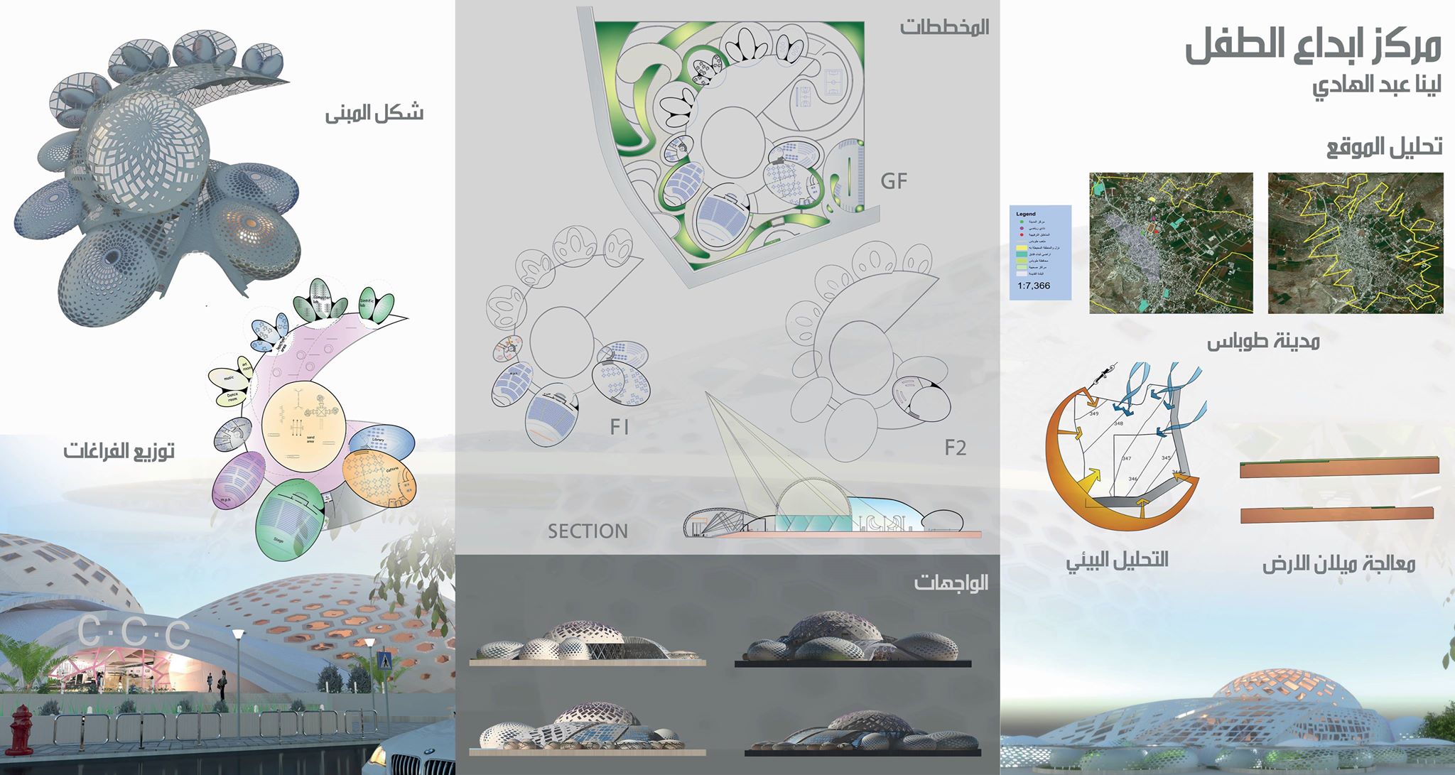 The use of domes with the celestial openings and exit from the mouf in the shape of the dome to imitate their curiosity every dome or group of domes overlapping represent the main stages for children to put them on the path of creativity
