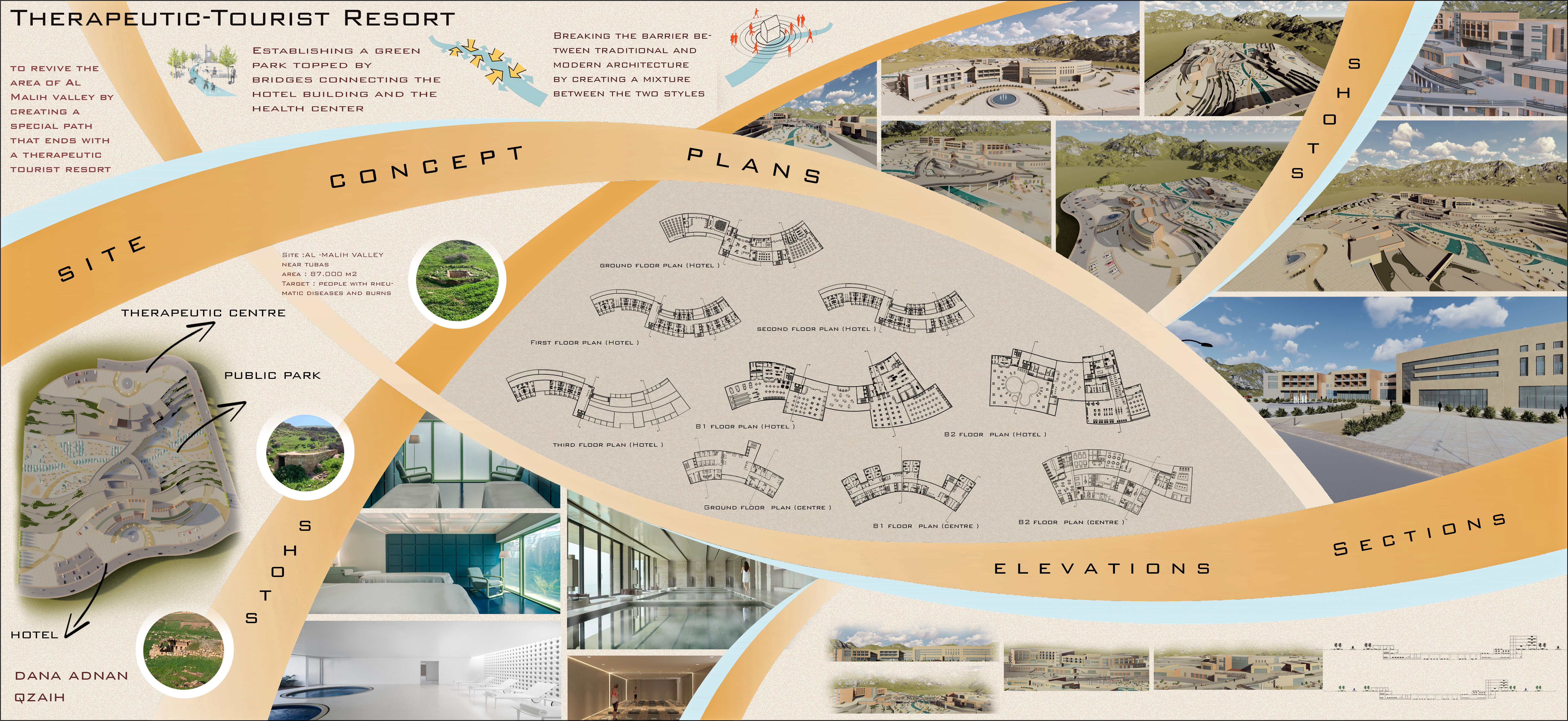 Palestine is one of the important tourist areas in the middle east, due to the large number of tourist places and the diversity in them and the abundance of ancient monuments, summer natural resorts, but there are many abandoned tourist and therapeutic areas, and so appears the goal of establishing this project, by restoring consideration to that region known historically for its therapeutic importance, and which is still subjected to violations by the occupation in an attempt to take control on it, and the establishment of a therapeutic tourist resort in that region It would enhance its resistance, the main idea of the project is to establish a tourist hotel, in addition to a treatment center dealing with dermatology, rheumatism and post-traumatic cases, and the bridges that connect them, so that the project appears as one building that combines medical use and the features of a hotel resort , and so, achieving a harmonious exchange between health and nature throughout the building, where the main shapes of the project came in line with the topography of the site, so that the project appears as one entity with the main site.
