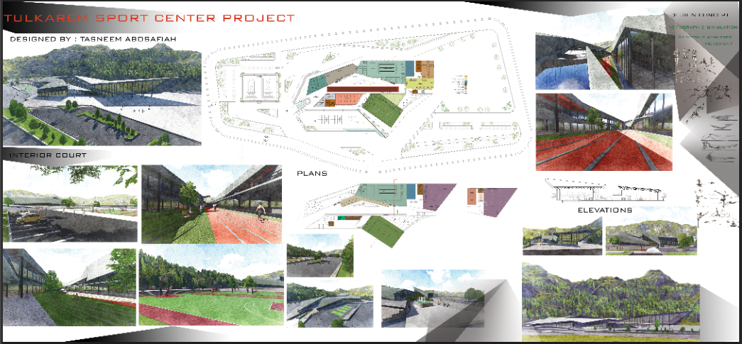 The two graduation projects are the design of a sports center in the north-east of the city of Tulkarm, located on the area of Sahlia, along the mountain of Al-Ahraash on the Nablus road opposite the new Al-Quds Open University (under construction) and the housing engineers ... The idea of the project started from the need of people to sports centers and Such as these centers and attention to their health and fitness ... The idea of the project was inspired by Jabal Al Ahrach, which characterizes the entrance to Tulkarem was the building simulates the topography of the site and reflects the movements of athletes in a dynamic way reflected in the form of the building,