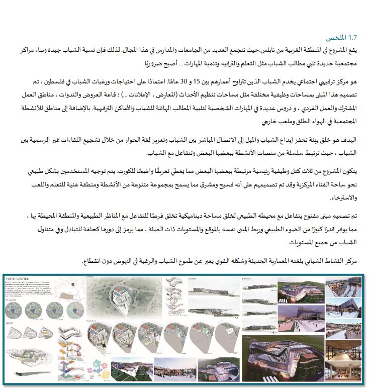 | dc.description.abstract | This is my graduation project in An-Najah National University. It is located in the western region of Nablus. Many universities and schools.... assemble in this areas. Therefore the proportion of young people is good and constructing new community centers which supply for young people's demands like learning, entertainments, developing skills ... become necessary. It is a social entertainment center serving youth aged 15-30 years. Relying on the needs and desires of the youth in Palestine, this building was designed with various functional spaces like spaces for organizing events ( exhibitions, advertisements...);Auditorium for performances and seminars, areas for co-working and individual work, for many classes on personal skills to meet the huge demands of the youth and recreational spaces. In addition, areas for community activities in the open air and an outdoor playground The goal is to create an environment that stimulates youth creativity and the tendency to direct contact between young people and to promote the language of dialogue by encouraging informal meetings between young people, where a series of activities platforms linked to each other and interacting with young people The project consists of three main functional blocks that are linked together which gives a clear definition to the court. Users are naturally directed towards the central courtyard and are designed as spacious and bright allowing a variety of activities and a rich area for learning, playing and relaxing. An open building that interacts with its natural surroundings is designed to create a dynamic space that creates opportunities for interaction with the landscape and the surrounding area, providing a large amount of natural light and linking the building itself to the site and related levels, symbolizing its role as a link for exchange and accessible to young people of all levels. With its modern architectural language and strong shape, the Youth Activity Center expresses the ambition of young people and the aspiration to rise without interruption | en_US |