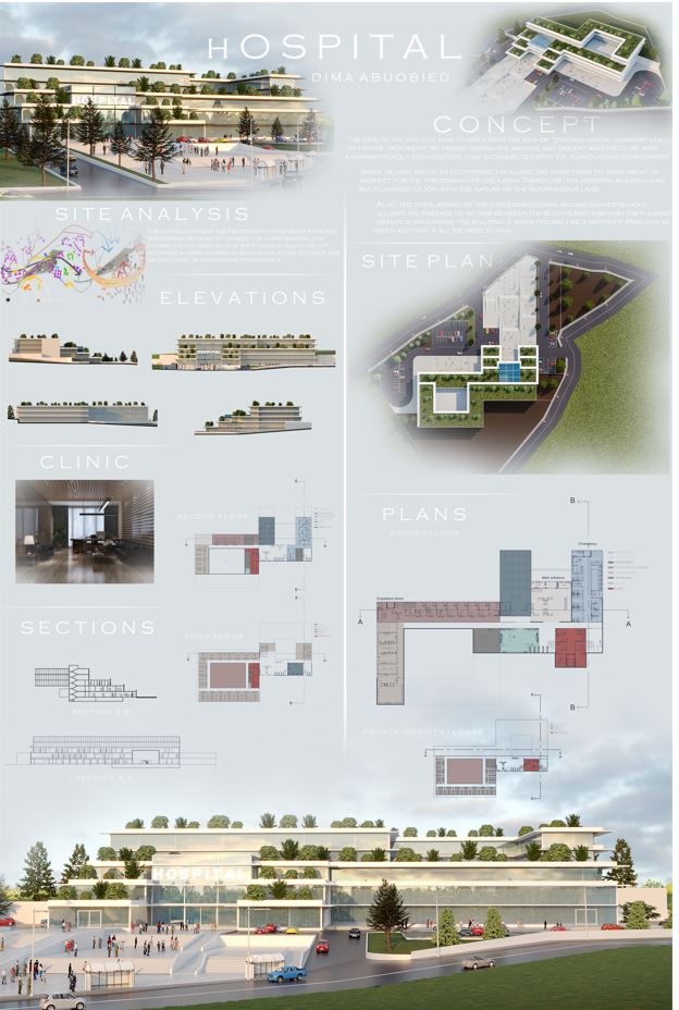 The idea of the project aims to implement the idea of “psychological comfort leads to faster treatment” by transforming massive and violent architecture into human-friendly architecture linked to the surrounding environment And when talking about an environmentally friendly building, the first thing to think about is respecting the topography of the land, so, the hospital building was multi-layered to match the nature of the mountainous land Also the overlapping of the 3D square blocks allows the passage of nature between the blocks and through the flowing nature surrounding the building, a warm feeling can be given like a mother's arms and that's all we need to heal