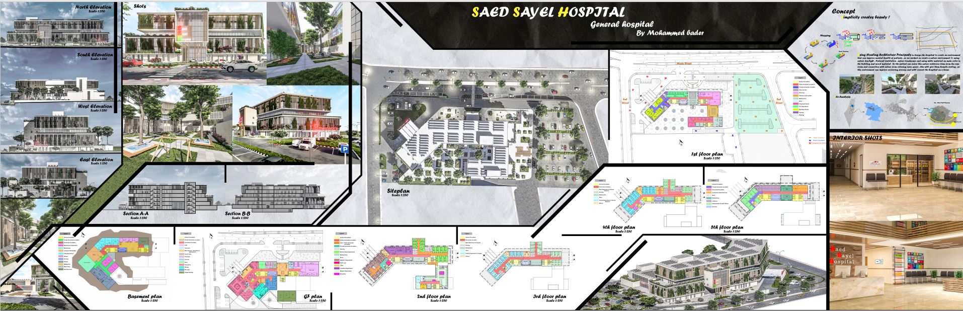 The hospital was built on an area of approximately 17,000 square meters, with 150 beds. The parts of the building have been linked through a transparent main vital area that works to integrate the parts of the building into one entity and work as one body and create a kind of hierarchy between public and private areas