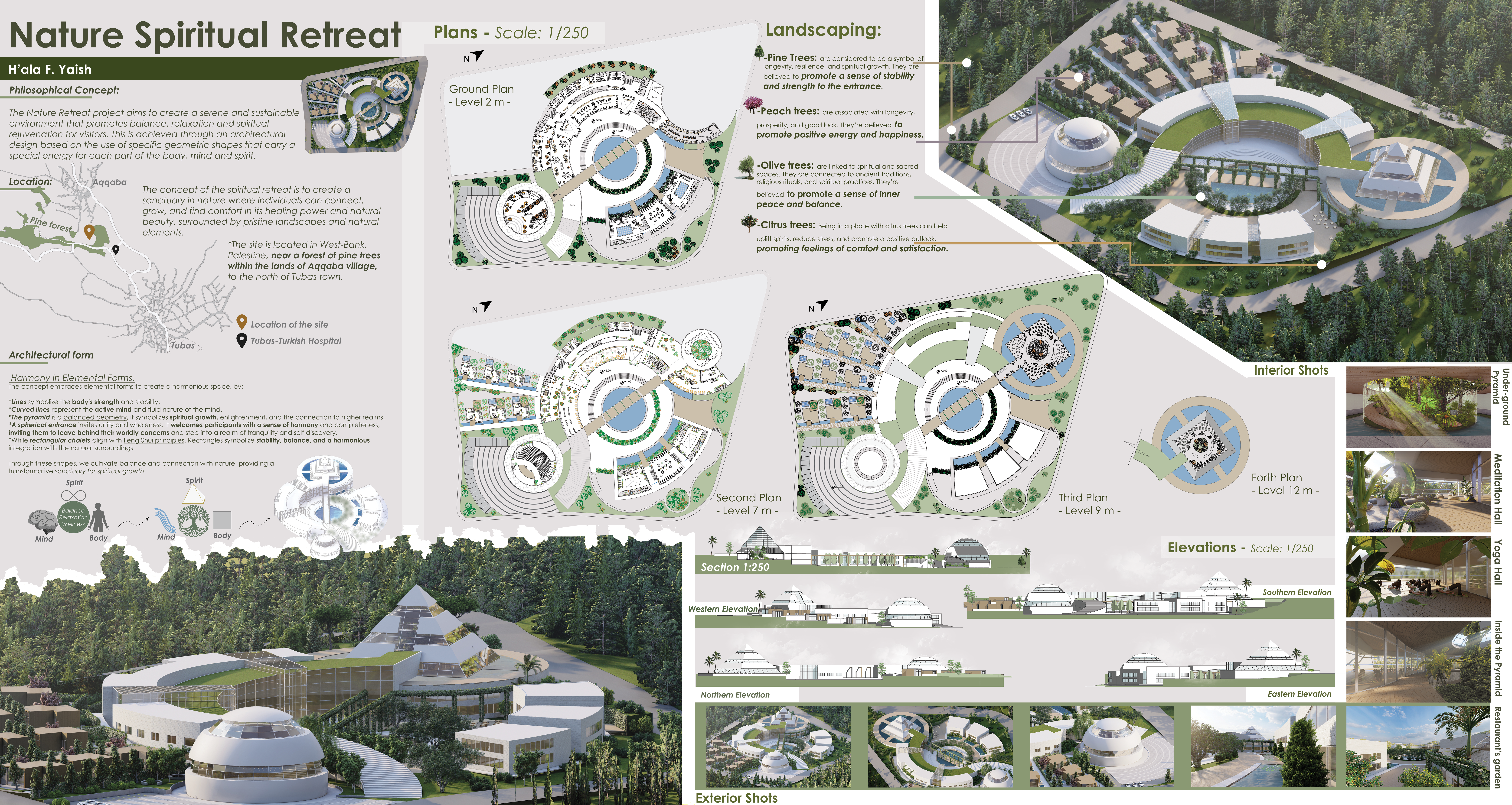 Through a comprehensive exploration of retreat concepts, detailed program development, and site analysis, this thesis seeks to present a well-informed design proposal for a nature spiritual retreat. The aim is to create a sanctuary that offers individuals a transformative space for self-reflection, inner peace, and spiritual growth, while harmonizing with the beauty and serenity of the natural surroundings.