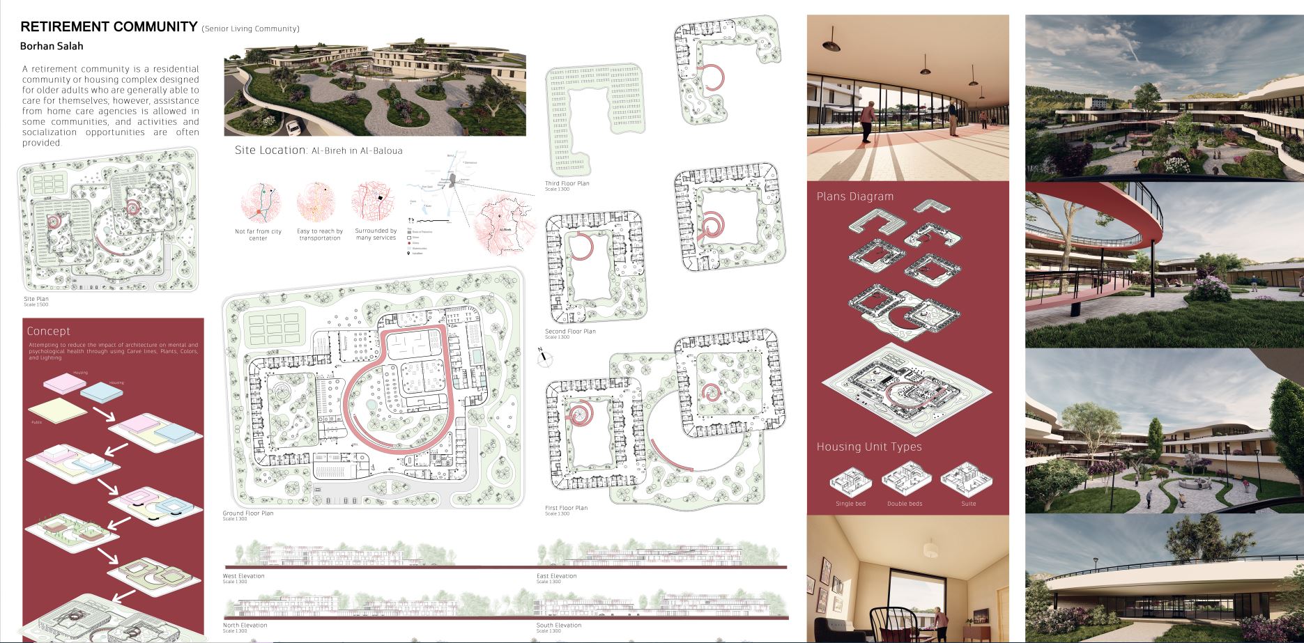 The main objective is to creating a special environment for the elderly in which most of their needs are met at these age stages, by designing the building according to the determinants that give psychological and mental comfort to the users, such as the use of curved lines and the availability of green areas and to provide good amount of lighting and the use of colors.