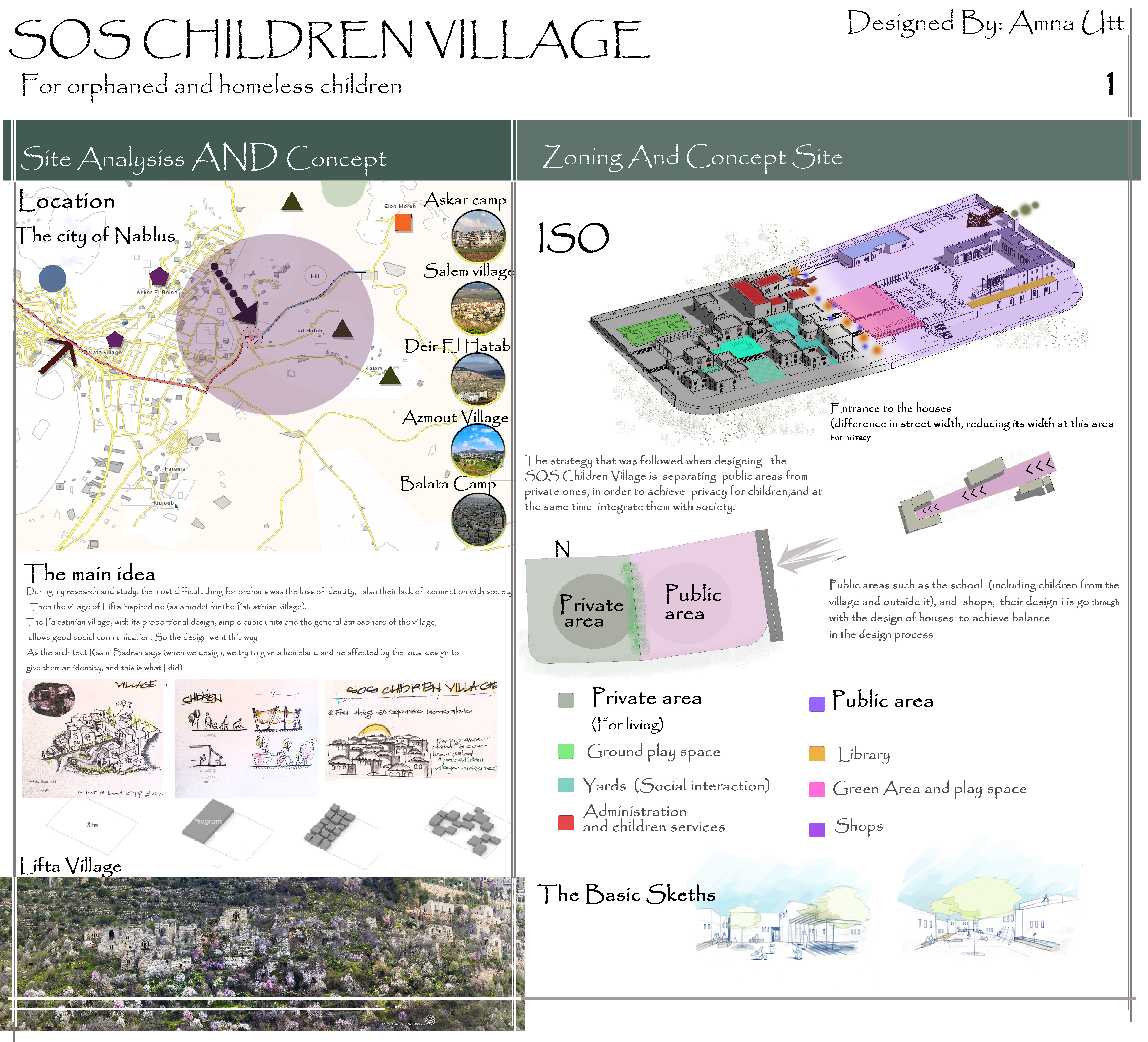 Orphan children face many difficulties, including the loss of identity, and this affects them socially, so I tried to solve this problem. The Palestinian village of Lifta was inspired by a percentage that does not go to this way of design, in the style of Palestinian villages and what it has in terms of skil and social atmosphere that suits children and makes them feel Belonging, I interpreted this curve