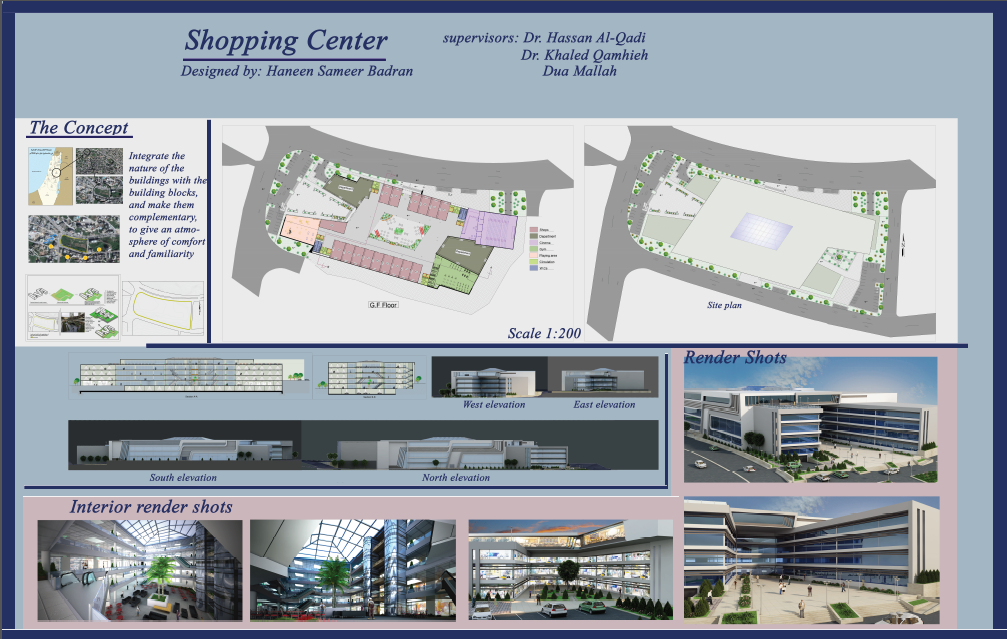 | dc.description.abstract | This project was chosen in particular because the city of Nablus lacks the presence of shopping centers similar to those abroad ... in terms of jobs, use or even the level of architectural design. The location of the project is far from the busy city center and easy access to it from all sides at the same time. The idea of the project is the existence of two external courts working to merge the green spaces with the blocks, which gives life to the project and maintains parts of the remaining land and increases the display interfaces used and breaks the stereotype Almolat familiar. The project includes shops, a cinema, a gym, a games area as well as restaurants and cafés. | en_US |