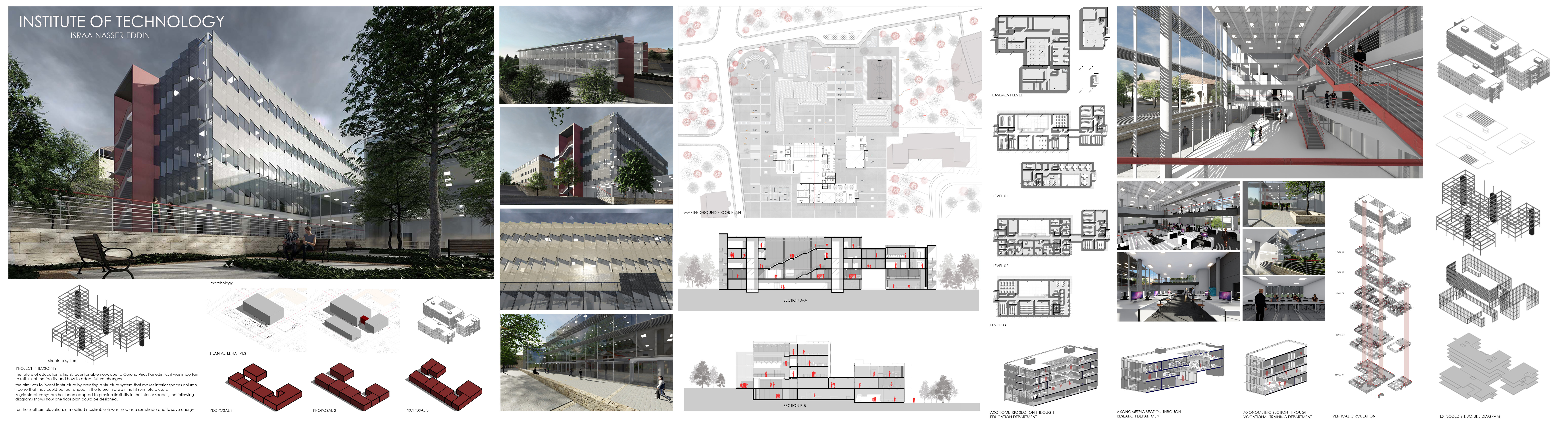 The future of education is highly questionable now, due to Corona Virus Pandemic, it was important to rethink of the facility and how to adapt future changes. The aim was to invent in structure by creating a structure system that makes interior spaces column free so that they could be rearranged in the future in a way that it suits future users. A grid structure system has been adopted to provide flexibility in the interior spaces, the following diagrams shows how one floor plan could be designed. For the southern elevation, a modified Mashrabiye was used as a sun shade and to save energy.