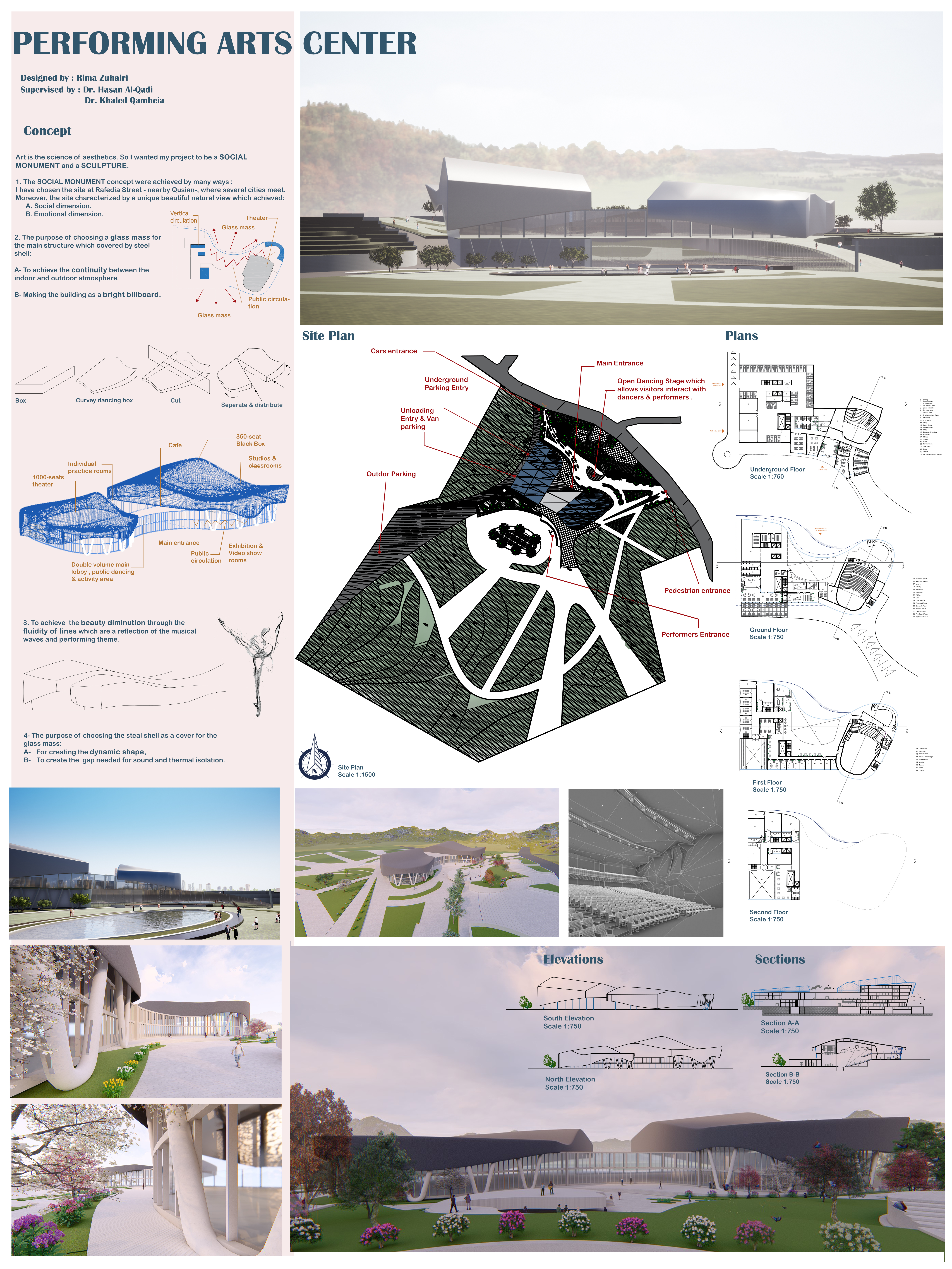1. The SOCIAL MONUMENT concept were achieved by many ways : I have chosen the site at Rafedia Street - nearby Qusian-, where several cities meet. Moreover, the site characterized by a unique beautiful natural view which achieved: