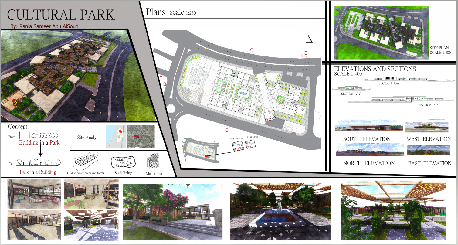 | dc.description.abstract | Building a strong society capable of keeping up with the development of life requires the preparation of individuals and the generation to be more conscious and able to discuss their point of views and ideas with others, so it was necessary to design architectural projects to revive the love of reading and make it a habit especially for the youth. The project was designed to meet the urgent need for human beings to discover new ideas and share it with others. So a garden with a group of reading clubs, administrative building and a cafeteria are distributed throughout the site with green spaces that gathers the families, a playground for children and an open auditorium. The goal was to create a comfortable and encouraging environment for reading, as well as achieving the interaction between the pioneers of reading clubs and the garden visitors, and this was clear in taking into account the idea of visual communication between inside and outside the buildings through the use of glass facades, taking into account the use of architectural shading elements when necessary as well as designing an open space for each club. The clubs are seven: (Poetry Club, Novel Club, Sociology Club, Religion Science Club, Natural Science Club, movie Club, Children's Club). The purpose from designing a garden that contains a group of clubs is to achieve the main idea which is (From BUILDING in a PARK to PARK in a BUILDING) to help people reach and interact with the whole site. | en_US |