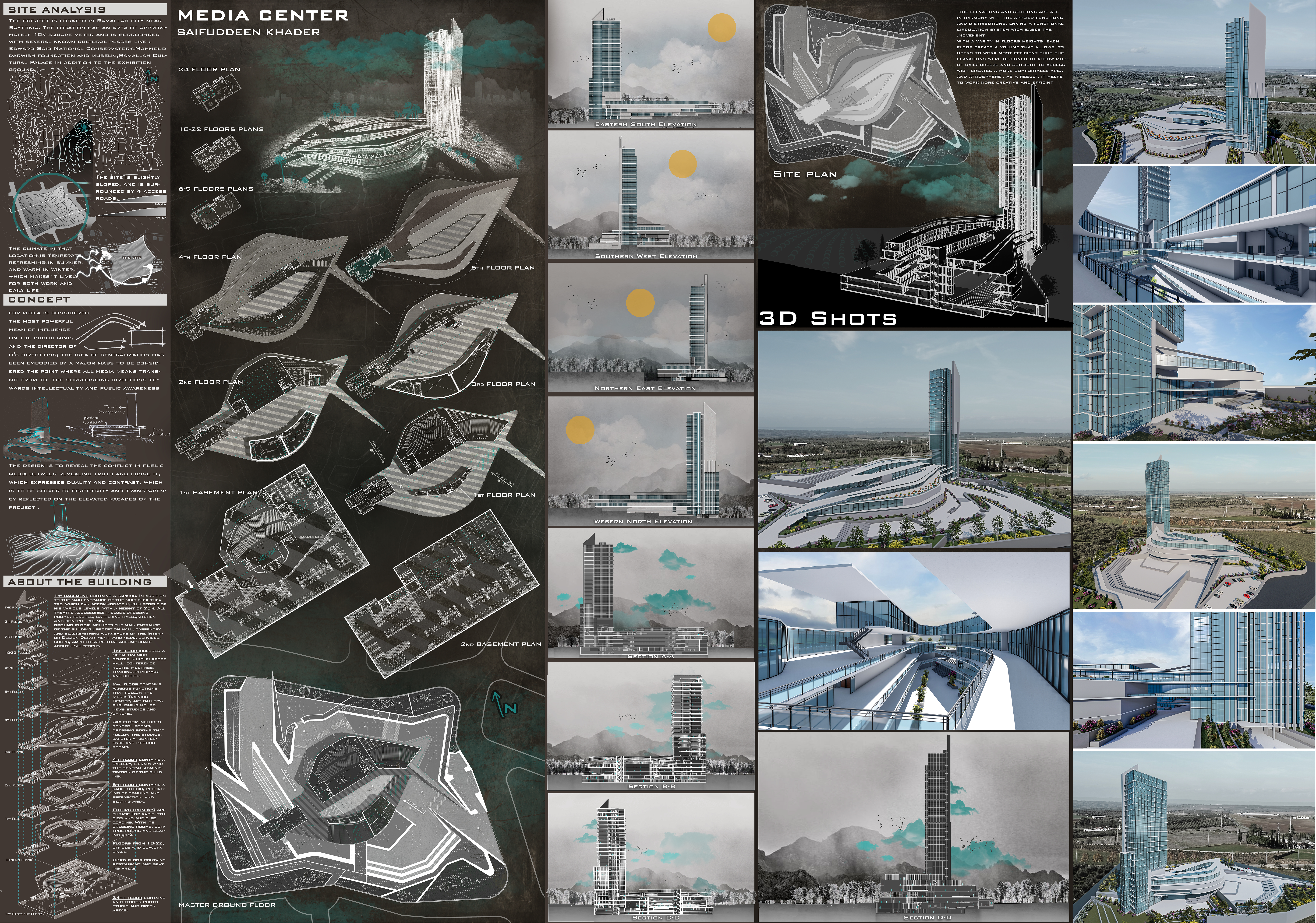 | dc.description.abstract | The first basement contains a parking. In addition to the main entrance for the general people of the multiplix theater, which can accommodate 2,900 people of his various levels, with a height of 25 meters. All theater accessories include dressing rooms, porches, gathering halls , and kitchen. And control rooms. The ground floor includes the main entranceof the building , reception hall, carpentry and blacksmithing workshops of the Interior Design Department. And media services in addition to the shops, amphitheater of seminars and various events that accommodate about 850 people. The first floor includes a media training center, multipurpuse hall and conference rooms, meetings and training in addition to the pharmacy and shops. The second floor contains various functions that follow the Media Training Center in addition to the art gallery, the publishing and publishing house, news studios and chrome. . On the third floor are the control rooms and the dressing rooms that follow the studios .. And the main cafeteria of the building . also includes conference and meeting rooms. The fourth floor contains a gallery of books and magazines. In addition to the library. And the general administration of the building. The fifth floor contains a radio studio and a recording of training and preparation. and seating area. Floors from 6-9 are phrase For radio studios and audio recording. With its dressing rooms and control rooms.and seating area . Floors from 10-22, offices and cowork space. The 23rd floor contains resturant and seating areas The 24th floor contains an outdoor photo studio and green areas. | en_US |