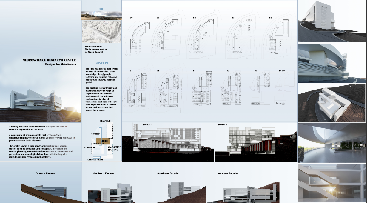 The project includes a research department that contains laboratories in various research fields, in addition to a cultural section consisting of a library, an information and publishing department, an administrative department, an educational department, a clinical section for brain patients, a magnetic imaging department, community areas such as the hall, a restaurant, official gathering areas and other Formal.