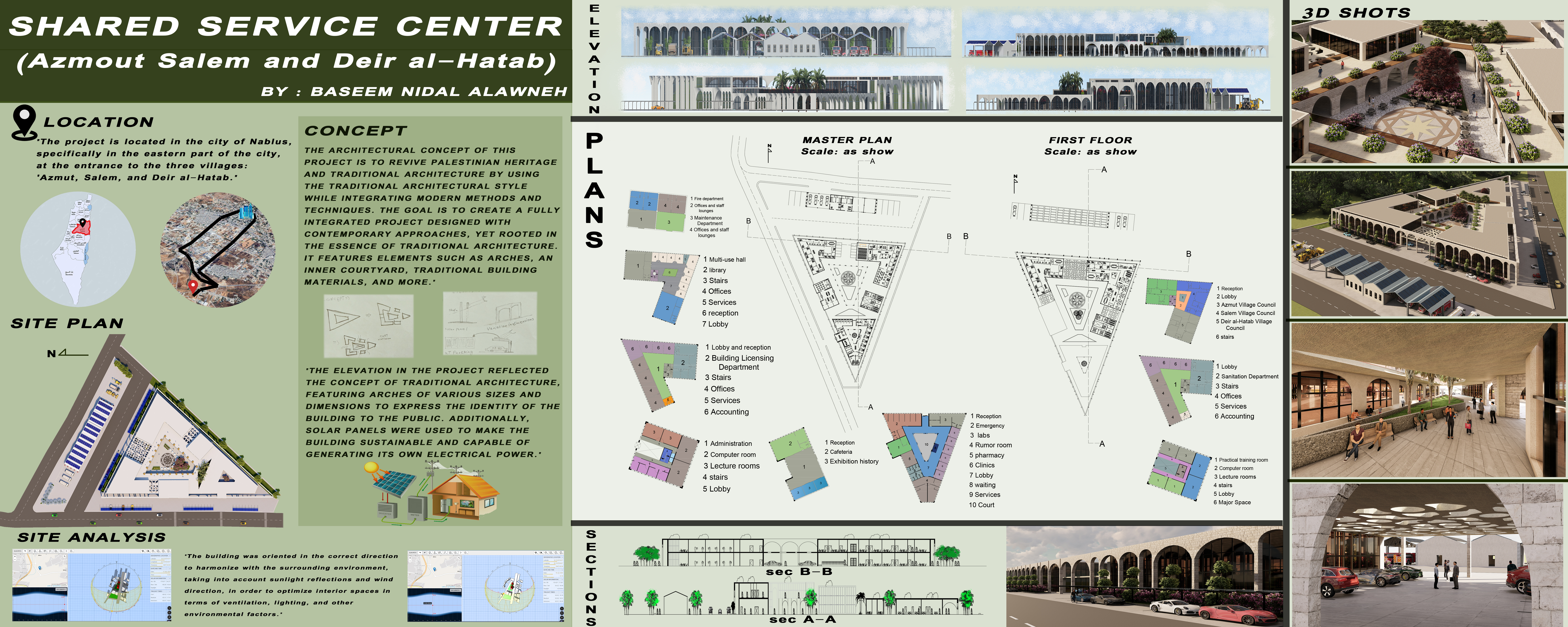 This graduation project aims to design a Joint Services Center that serves the local population by providing a comprehensive range of essential services, including healthcare, engineering services, and facilities dedicated to cultural and heritage-related functions. The project reflects the identity and needs of the local community through its multi-functional approach.