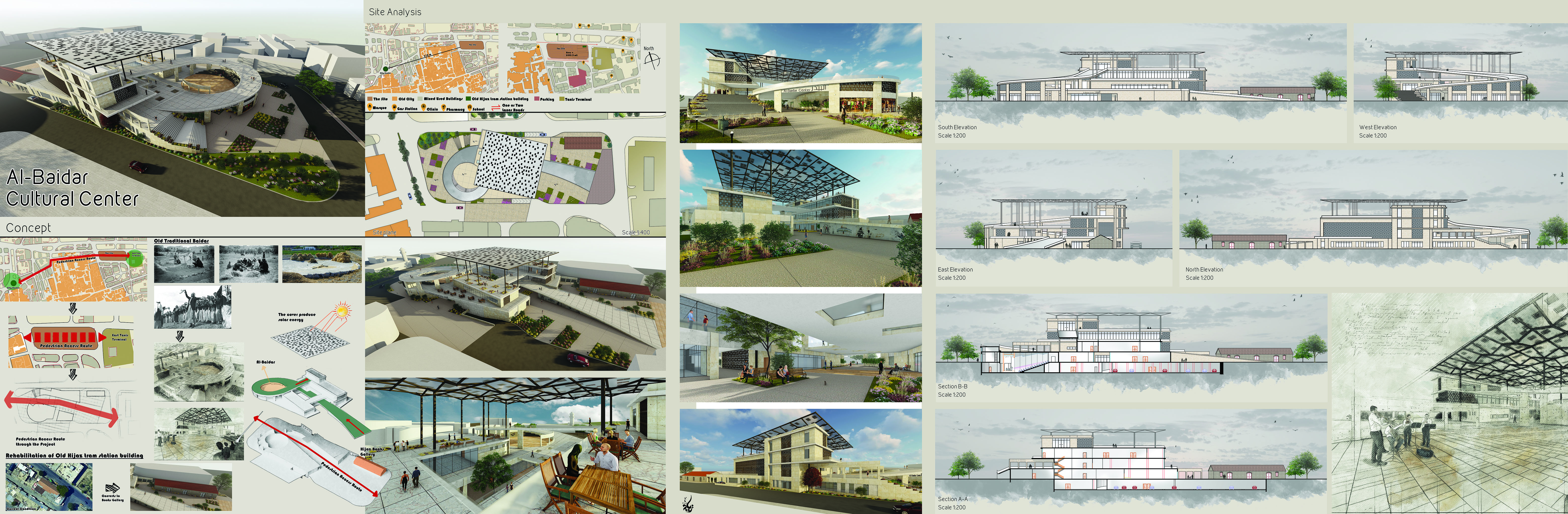 Cultural, social, and economic elements in the Palestinian heritage was Al-Baidar. This is the area where crops are separated and filled. In many cases, the circular shape takes place, and there are many occasions and cooperation between the members of different families. This is reflected in the circular shape of the project, which includes an open outdoor theatre and an internal theatre. To reflect the economic character and preserve the character of the site, which is a commercial area, some shops were added in the circular shape representing the podium.